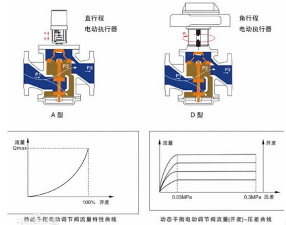 ⑵、當(dāng)直行程電動(dòng)執(zhí)行器接受控制信號(hào)使閥軸延A—B向上下運(yùn)動(dòng)(或角行程電動(dòng)執(zhí)行器接受控制信號(hào)使閥軸延R向旋轉(zhuǎn))時(shí),P2、P3間的開度也隨之變化。由于不管系統(tǒng)壓差(P1-P3)如何變化,P2、P3間的壓差(P2-P3)始終不變,因此對(duì)應(yīng)于任一開度位置,其輸送的水流量都是一定的,并且電動(dòng)調(diào)節(jié)閥實(shí)際的流量特性曲線與其理想的流量特性曲線是一致的,沒有偏離。因此這種電動(dòng)調(diào)節(jié)閥較傳統(tǒng)的電動(dòng)調(diào)節(jié)閥具有更好的調(diào)節(jié)特性。 動(dòng)態(tài)平衡電動(dòng)調(diào)節(jié)閥結(jié)構(gòu)圖: