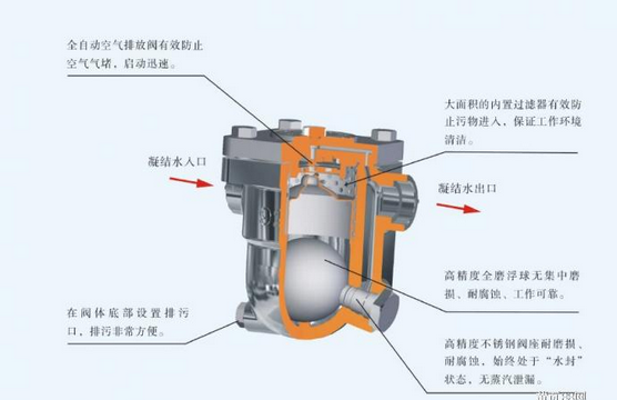 自由浮球式蒸汽疏水閥的結構簡單,內部只有一個精細研磨的不銹鋼空心浮球,既是浮子又是啟閉件,無易損零件,使用壽命很長。裝置剛起動時,管道內出現空氣和低溫冷凝水,手動排空氣閥能迅速排除不凝結氣體,疏水閥開始進入工作狀態,低溫冷凝水流進疏水閥,凝結水的液位上升,浮球上升,開啟閥門。裝置很快提升溫度,管道內溫度上升到飽和溫度之前,自動排空氣閥已經關閉;裝置進入正常運行狀況,凝結水減少,液位下降,浮球隨液位升降調節閥孔流量;當凝結水停止進入時,浮球隨介質流向逼近閥座,關閉閥門。自由浮球式蒸汽疏水閥的閥座總處于液位以下,形成水封,無蒸汽泄漏。
