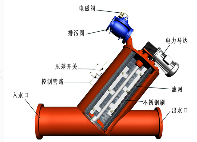 過濾器上端蓋上的排污閥;馬達帶動本體濾網內的兩把不銹鋼刷轉動,被濾網所捕捉的雜質因此被鋼刷刷下并從
