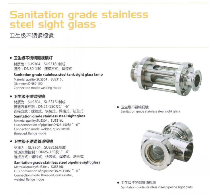 【衛(wèi)生級視鏡】不銹鋼結構和玻璃組成。360度觀看角度,可以垂直或水平使用。在食品加工、化妝品、制藥和精細化工業(yè)中,可以通過它清晰并且精確的觀察到物料的流動。是工業(yè)管道裝置上主要附件之一,在石油、化工、醫(yī)藥、食品等工業(yè)生產裝置的管道中,視鏡能隨時觀察管道中的液體、氣體、蒸氣等介質的流動及反應情況,起到監(jiān)視生產、避免生產過程中事故發(fā)生的作用。