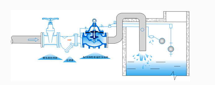 電磁遙控浮球閥原則:主室和控制閥與浮閥,浮閥固定在水箱表面。水平下降自動打開浮球閥,主閥打開,水箱供水;當浮閥液面位置達到時,浮閥關閉,主閥關閉停止向水箱供水。