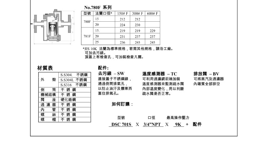 臺灣DSC倒筒式疏水閥780F材質表: