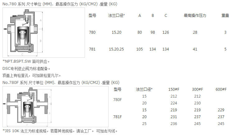 臺灣DSC倒筒式疏水閥780F尺寸: