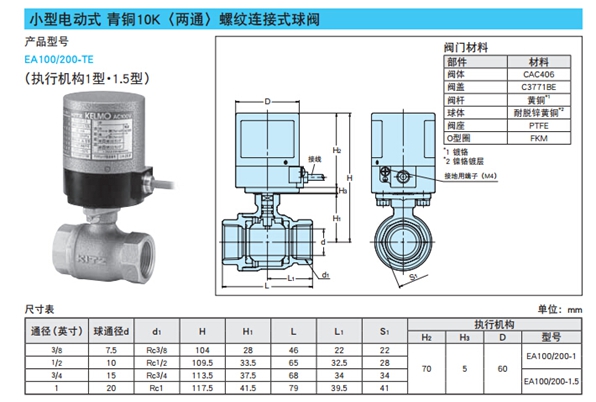 產品名稱:EA100-TE/EA200-TE KITZ電動青銅絲扣球閥