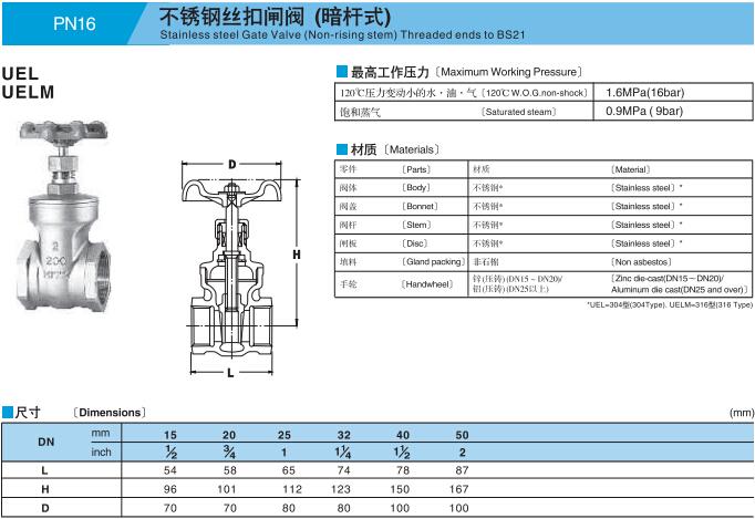 UEB-M絲扣閘閥-KITZ不銹鋼閘閥說明: